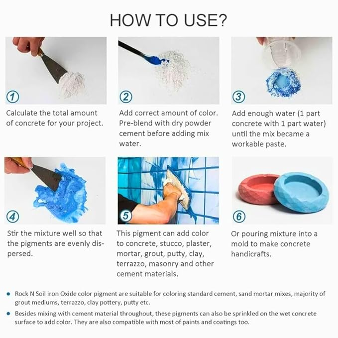 Mix small amounts of pigment in your resin, cement, or paint to achieve the perfect shade.